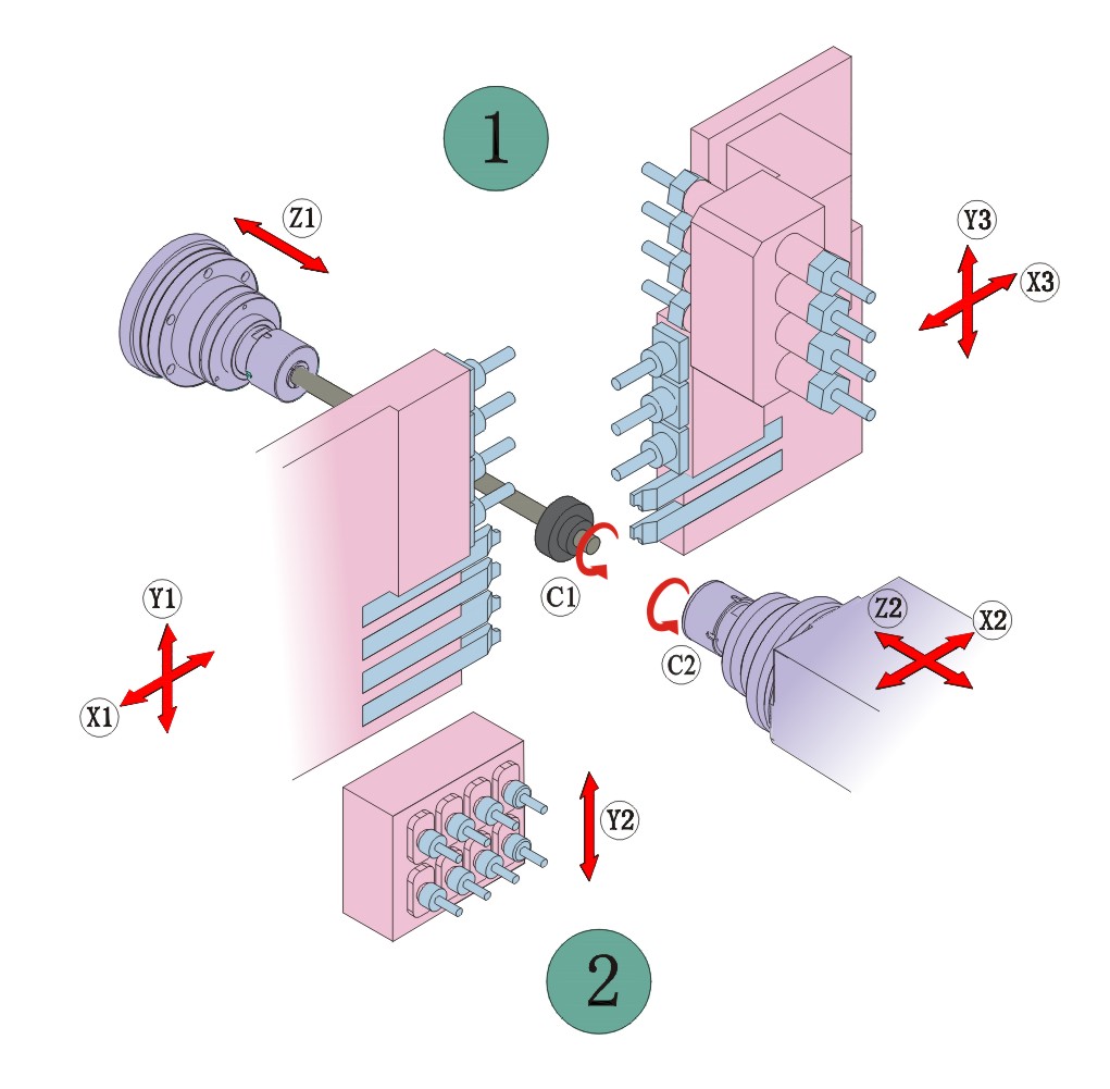 8、三通道控制方式,主軸端雙X、雙Y軸控制兩把刀具同時(shí)與工件接觸,可實(shí)現(xiàn)兩側(cè)同時(shí) 銑面、車削、打孔工藝,大大節(jié)省了加工效率。